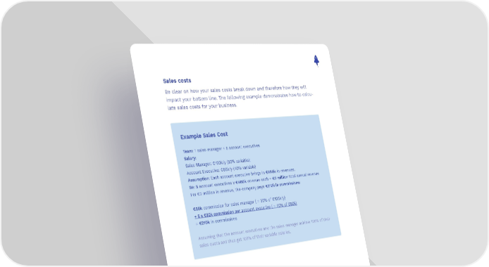 Sales costs Be clear on how your sales costs break down and therefore how they will impact your bottom line. The following example demonstrates how to calcu- late sales costs for your business. Example Sales Cost Team: 1 sales manager + 5 account executives Salary: Sales Manager: €100k/y (50% variable); Account Executive: €80k/y (40% variable) Assumption: Each account executive brings in €400k in revenues. So: 5 account executives x €400k revenue each = €2 million total annual revenue For €2 million in revenue, the company pays €210k in commissions: €50k commission for sales manager ( = 50% of €100k/y) + 5 x €32k commission per account executive ( = 40% of €80k) = €210k in commissions Assuming that the account executives and the sales manager achieve 100% of their sales quota and thus get 100% of their variable salaries. 28
