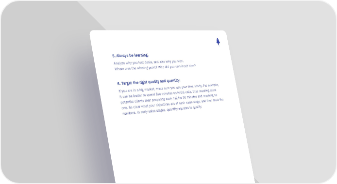 5. Always be learning. Analyze why you lost deals, and also why you won. Where was the winning point? Who did you convince? How? 6. Target the right quality and quantity. If you are in a big market, make sure you use your time wisely. For example, it can be better to spend five minutes on initial calls, thus reaching more potential clients than preparing each call for 30 minutes and reaching no one. Be clear what your objectives are at each sales stage, and then trust the numbers. In early sales stages, quantity equates to quality. 62