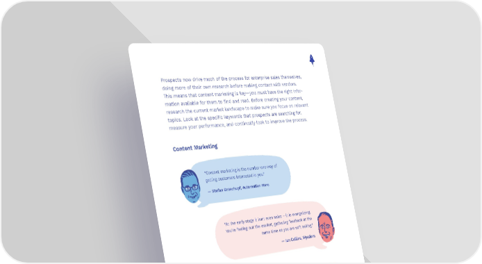 Prospects now drive much of the process for enterprise sales themselves, doing more of their own research before making contact with vendors. This means that content marketing is key—you must have the right infor- mation available for them to find and read. Before creating your content, research the current market landscape to make sure you focus on relevant topics. Look at the specific keywords that prospects are searching for, measure your performance, and continually look to improve the process. Content Marketing “Content marketing is the number one way of getting customers interested in you.” — Stefan Groschupf, Automation Hero “At the early stage it isn’t even sales – it is evangelizing. You’re feeling out the market, gathering feedback at the same time as you are soft selling.” — Ian Collins, Wysdom A specific way of evaluating buying interest and helping qualify where your prospects are in the sales funnel is to use content honey pots. These provide a variety of related pieces of content—you can then map interest in relation to the sales funnel. So, if a prospect downloads a white paper on “What is big data?” they are likely to be at the top of the funnel, compared to “Big data in production” which is much closer to the point of reaching a decision. 10