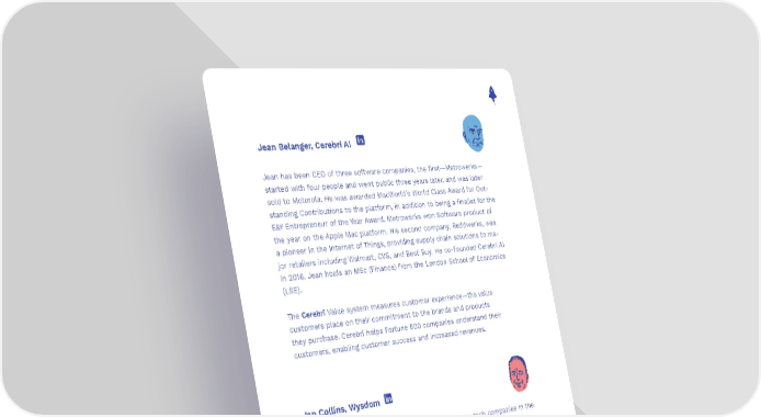 Jean Belanger, Cerebri AI Jean has been CEO of three software companies, the first—Metrowerks— started with four people and went public three years later, and was later sold to Motorola. He was awarded MacWorld’s World Class Award for Out- standing Contributions to the platform, in addition to being a finalist for the E&Y Entrepreneur of the Year Award. Metrowerks won Software product of the year on the Apple Mac platform. His second company, Reddwerks, was a pioneer in the Internet of Things, providing supply chain solutions to ma- jor retailers including Walmart, CVS, and Best Buy. He co-founded Cerebri AI in 2016. Jean holds an MSc (Finance) from the London School of Economics (LSE). The Cerebri Value system measures customer experience—the value customers place on their commitment to the brands and products they purchase. Cerebri helps Fortune 500 companies understand their customers, enabling customer success and increased revenues. Ian Collins, Wysdom An entrepreneur and investor, Ian has founded seven tech companies in the last 20 years, primarily in the enterprise software space, including Wyrex, Mobile Diagnostix (HP), Clickfree, and most recently Wysdom. Ian invests, mentors, and sits on the boards of several startups in the Toronto area. He has raised over $150 million in venture capital. Wysdom is the world’s leading cognitive care solution, using AI to provide a single place to understand the customer need, respond with a great solution, and learn from customer behavior. Headquartered in Toronto, Canada, with offices in Kansas City and London, Wysdom is trusted by leading brands like Rogers, Sprint, C Spire, and Digicel. 84