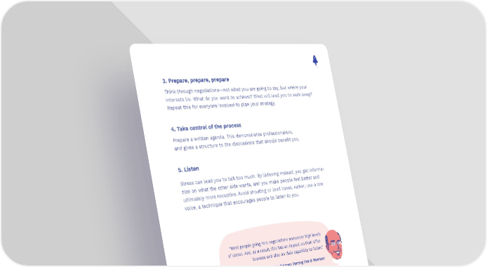 3. Prepare, prepare, prepare Think through negotiations—not what you are going to say, but where your interests lie. What do you want to achieve? What will lead you to walk away? Repeat this for everyone involved to plan your strategy. 4. Take control of the process Prepare a written agenda. This demonstrates professionalism, and gives a structure to the discussions that should benefit you. 5. Listen Stress can lead you to talk too much. By listening instead, you get informa- tion on what the other side wants, and you make people feel better and ultimately more receptive. Avoid shouting or loud tones; rather, use a low voice, a technique that encourages people to listen to you. “Most people going into negotiations encounter high levels of stress. And, as a result, this has an impact on their effec- tiveness and also on their capability to listen.” — Daniel Reisner, Herzog Fox & Neeman 6. Location is not an issue Don’t be concerned about where you negotiate. Home team advantage is only a factor if you believe in it. Being away from your office can be a posi- tive—you can hit the pause button, say that you need to check with a boss or colleague who is not present, or ask for a break more easily. This is more difficult if you are in your own office, where everyone is available. 65