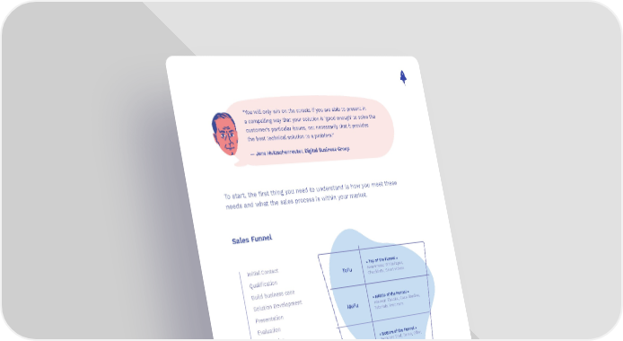 “You will only win on the streets if you are able to present in a compelling way that your solution is ‘good enough’ to solve the customer’s particular issues, not necessarily that it provides the best technical solution to a problem.” — Jens Hutzschenreuter, Digital Business Group To start, the first thing you need to understand is how you meet these needs and what the sales process is within your market. Sales Funnel Initial Contact « Top of the Funnel » Qualification ToFu Awareness: WhitePaper, Checklists, Short videos Build business case Solution Development « Middle of the Funnel » Presentation MoFu Interest: Ebooks, Case Studies, Tutorials, Webinars Evaluation Negotiation Closing « Bottom of the Funnel » BoFu Decision: Trial, Demo, Offer, Renewal Meetings, Sale Source: Stefan Groschupf, Automation Hero Spend time to understand the buyer journey for your product or solution. Prospects have different needs and different levels of interest across the stages of the sales funnel. Think about how you can first attract them and then move them toward the final sale. 7