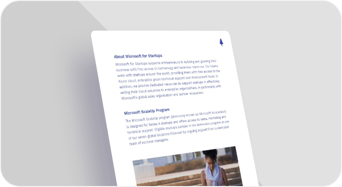 About Microsoft for Startups Microsoft for Startups supports entrepreneurs in building and growing their business with free access to technology and business resources. Our teams work with startups around the world, providing them with free access to the Azure cloud, enterprise grade technical support and development tools. In addition, we provide dedicated resources to support startups in effectively selling their cloud solutions to enterprise organizations, in partnership with Microsoft’s global sales organization and partner ecosystem. Microsoft ScaleUp Program The Microsoft ScaleUp program (previously known as Microsoft Accelerator) is designed for Series A startups and offers access to sales, marketing and technical support. Eligible startups partake in the immersive program at one of our seven global locations followed by ongoing support from a dedicated team of success managers. Microsoft for Startups, helping you build, grow and connect Microsoft for Startups is a unique program designed to accelerate the growth of startups with free access to technology and business support. To learn more and to see if you qualify, visit startups.microsoft.com 5