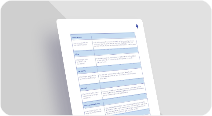 Which market? How do you identify the Look at demand (such as inbound requests), market size, existing reference next market to enter? customers, business drivers, and the complexity of setting up there; then compare different markets and choose the most attractive in monetary terms. Office When do you open In the early stages, you can simply rent an office address and travel there an office in the to keep costs light. As the business develops, you can then create a new market? full organization. Legal Entity When do you establish a le- You may need to create a legal entity early to help with sales. gal entity/local subsidiary? However, that doesn’t mean you need to employ staff directly until much later. Founders What should be the role of In Europe, a founder can simply travel to manage new markets. However, founders when entering a if entering the US, one of the founding team should move there for at least a new market? year to provide direct oversight of operations. First Employee/Sales Rep. When do you hire the first Start searching for candidates immediately after you enter the market, but sales rep. for the new mar- don't employ someone until you have certain amount of traction, such as 2-4 ket? test customers. Then you can commit to hiring an account executive with relevant market experience, selling to your target markets. Next Employees Which employees should be Scale the sales team as in your first country, adding a SDR, pre-sales engineer hired next? as you grow. Country Manager/MD When do you hire a country Don’t hire a local country manager until you have a sufficient size of team manager? What skills do they (around five people). Ensure that they have local language skills, but most need? importantly that they have experience of selling locally to your target market. Sources: Stefan Groschupf, Automation Hero; Amnon Drori, Octopai; Jens Hutzschenreuter, Digital Business Group; Jens Lapinski, Angel Invest Ventures 47
