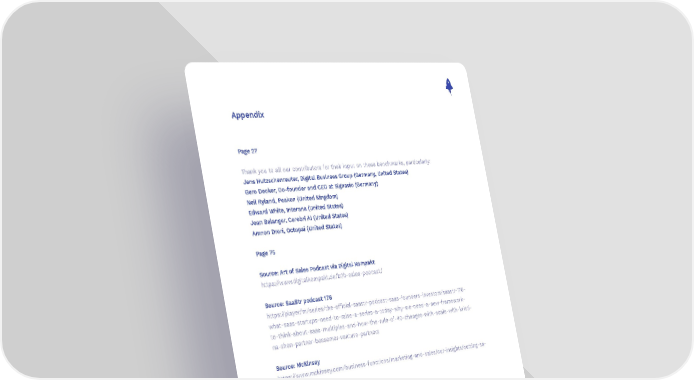 Appendix Page 27 Thank you to all our contributors for their input on these benchmarks, particularly: Jens Hutzschenreuter, Digital Business Group (Germany, United States) Gero Decker, Co-founder and CEO at Signavio (Germany) Neil Ryland, Peakon (United Kingdom) Edward White, Interana (United States) Jean Belanger, Cerebri AI (United States) Amnon Drori, Octopai (United States) Page 75 Source: Art of Sales Podcast via Digital Kompakt https://www.digitalkompakt.de/b2b-sales-podcast/ Source: SaaStr podcast 176 https://player.fm/series/the-official-saastr-podcast-saas-founders-investors/saastr-176- what-saas-startups-need-to-raise-a-series-a-today-why-we-need-a-new-framework- to-think-about-saas-multiples-and-how-the-rule-of-40-changes-with-scale-with-kristi- na-shen-partner-bessemer-venture-partners Source: McKinsey https://www.mckinsey.com/business-functions/marketing-and-sales/our-insights/cutting-sa- les-costs-not-revenues 94