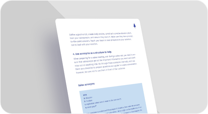Define a good script, create lively stories, construct a precise elevator pitch, train your salespeople, and ensure they learn it. Make sure they have prompt, to-the-point answers. Teach your team to lead prospects to your solution, not to lead with your solution. 4. Use acronyms as a structure to help. When preparing for a sales meeting, and during a sales call, you need to en- sure that salespeople get all the important information you need and don’t miss out on anything vital. Go through these acronyms internally, and use them as a checklist to prepare questions as a guide in a sales conversation. However, be sure not to use them in front of the customer. Sales acronyms SPIN S: Situation P: Problem I: Implication (what does it mean to the customer?) N: Need-payoff Ask questions to understand the prospect’s Situation, then make the prospect aware of Problems that need to be solved. Shine a light on the Implication of not solving/addressing the Problems, and then get the prospect to then visualize the Need-payoff (that is, what the benefits will be of a solution). BANT B: Budget - how much is the prospect willing and able to spend? A: Authority – who is the decision-maker? N: Need – is there an urgent business problem to address? T: Time – what is the timeframe for finding a solution? 61