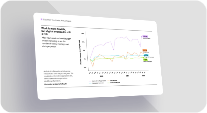 2022 Work Trend Index: Annual Report Work is more flexible, but digital overload is still a risk After-hours work and workday span are still increasing, as are the number of weekly meetings and chats per person Analysis of collaboration activity across Microsoft 365 tools the past two years. This visualization is based on aggregated data, without personal or organization- identifying information. Illustration by Valerio Pellegrini