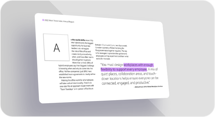 2022 Work Trend Index: Annual Report s the world shifts more fully into hybrid work, the biggest between 12 p.m. and 2 p.m., two days a week. opportunity for business Consider quarterly offsites that bring far- leaders is to reimagine flung teammates together regularly. The key A the role of the office and is for managers to provide clear guidance to create clarity around why, employees as they experiment and learn what when, and how often teams works for the team. should gather in person. More than a third (38%) of “You must design workplaces with enough hybrid employees say their biggest challenge is knowing when and why to come into the flexibility to support every employee. A mix of office. Yet few companies (just 28%) have established team agreements to clearly define quiet places, collaboration areas, and touch- the new norms. down locations helps ensure everyone can be Making the office work for all employees will take radical intentionality. There’s no connected, engaged, and productive.” one-size-fits-all approach: Experiment with “Team Tuesdays” or in-person office hours —Michael Ford, CVP of Global Workplace Services