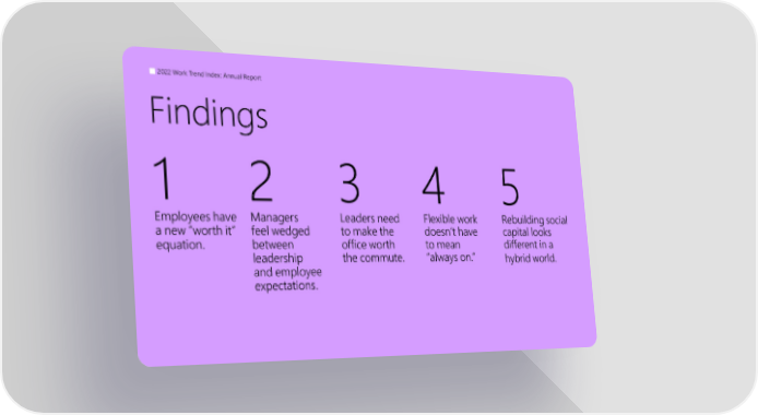 2022 W2022 Work Tork Trrend Index: Annual Reporend Index: Annual Reportt Findings 1 2 3 4 5 Employees have Managers Leaders need Flexible work Rebuilding social a new “worth it” feel wedged to make the doesn’t have capital looks equation. between office worth to mean different in a leadership the commute. “always on.” hybrid world. and employee expectations.