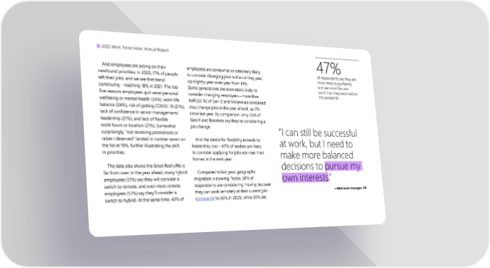 2022 Work Trend Index: Annual Report 47% And employees are acting on their employees are somewhat or extremely likely of respondents say they are newfound priorities. In 2020, 17% of people to consider changing jobs in the coming year, more likely to put family left their jobs, and we see that trend up slightly year-over-year from 41%. and personal life over continuing—reaching 18% in 2021. The top Some generations are even more likely to work than they were before five reasons employees quit were: personal consider changing employers—more than the pandemic wellbeing or mental health (24%), work-life half (52 %) of Gen Z and Millennials combined balance (24%), risk of getting COVID-19 (21%), may change jobs in the year ahead, up 3% lack of confidence in senior management/ since last year. By comparison, only 35% of leadership (21%), and lack of flexible Gen X and Boomers say they’re considering a work hours or location (21%). Somewhat job change. surprisingly, “not receiving promotions or “I can still be successful raises I deserved” landed in number seven on And the desire for flexibility extends to at work, but I need to the list at 19%, further illustrating the shift leadership, too—47% of leaders are likely in priorities. to consider applying for jobs not near their make more balanced homes in the next year. The data also shows the Great Reshuffle is decisions to pursue my far from over. In the year ahead, many hybrid Compared to last year, geographic employees (51%) say they will consider a migration is slowing. Today, 38% of own interests.” switch to remote, and even more remote respondents are considering moving because employees (57%) say they’ll consider a they can work remotely at their current job —Mid-level manager, UK switch to hybrid. At the same time, 43% of (compared to 46% in 2021), while 30% are