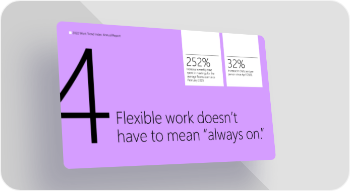 2022 W2022 Work Tork Trrend Index: Annual Reporend Index: Annual Reportt 252% 32% Increase in weekly time Increase in chats sent per spent in meetings for the person since April 2020. average Teams user since February 2020. Flexible work doesn’t 4have to mean “always on.”
