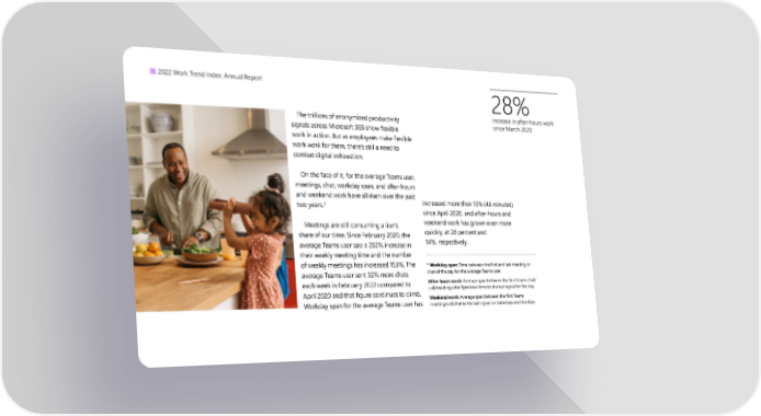 2022 Work Trend Index: Annual Report 28% The trillions of anonymized productivity increase in after-hours work signals across Microsoft 365 show flexible since March 2020 work in action. But as employees make flexible work work for them, there’s still a need to combat digital exhaustion. On the face of it, for the average Teams user, meetings, chat, workday span, and after-hours and weekend work have all risen over the past increased more than 13% (46 minutes) two years.3 since April 2020, and after-hours and Meetings are still consuming a lion’s weekend work has grown even more share of our time. Since February 2020, the quickly, at 28 percent and average Teams user saw a 252% increase in 14%, respectively. their weekly meeting time and the number of weekly meetings has increased 153%. The 3 Workday span: Time between the first and last meeting or average Teams user sent 32% more chats chat of the day for the average Teams user. each week in February 2022 compared to After-hours work: Average span between the first Teams chat/ April 2020 and that figure continues to climb. call/meeting after 5pm local time to the last signal for the day. Weekend work: Average span between the first Teams Workday span for the average Teams user has meeting/call/chat to the last signal on Saturdays and Sundays.