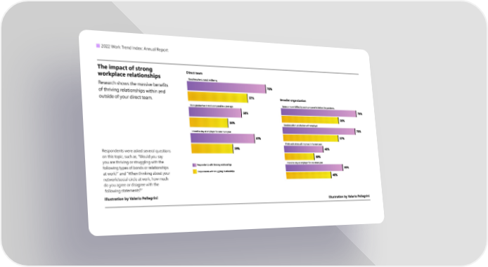2022 Work Trend Index: Annual Report The impact of strong Direct team workplace relationships Research shows the massive benefits of thriving relationships within and outside of your direct team. Broader organization Respondents were asked several questions on this topic, such as, “Would you say you are thriving or struggling with the following types of bonds or relationships at work?” and “When thinking about your network/social circle at work, how much do you agree or disagree with the following statements?” Illustration by Valerio Pellegrini Illustration by Valerio Pellegrini