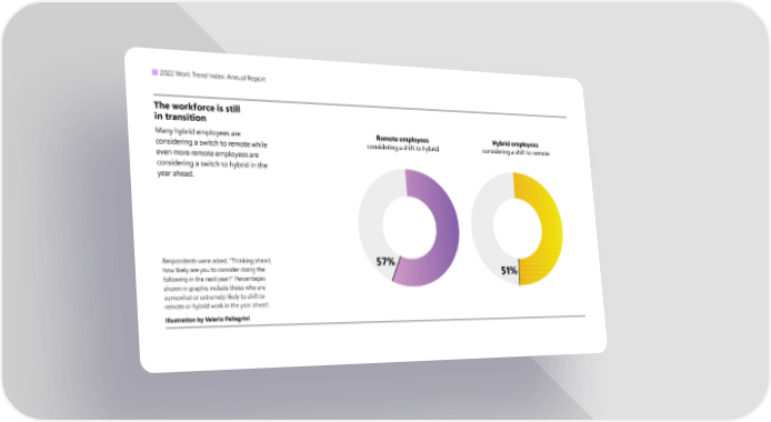 2022 Work Trend Index: Annual Report The workforce is still in transition Many hybrid employees are Remote employees Hybrid employees considering a switch to remote while considering a shift to hybrid considering a shift to remote even more remote employees are considering a switch to hybrid in the year ahead. Respondents were asked, “Thinking ahead, 57% how likely are you to consider doing the 51% following in the next year?” Percentages shown in graphic include those who are somewhat or extremely likely to shift to remote or hybrid work in the year ahead. Illustration by Valerio Pellegrini