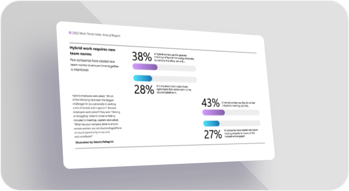 2022 Work Trend Index: Annual Report Hybrid work requires new team norms Few companies have created new team norms to ensure time together is intentional. Hybrid employees were asked, “Which of the following have been the biggest challenges for you personally in working a mix of remote and in person?” Remote employees were asked if they were “thriving or struggling” when it comes to feeling included in meetings. Leaders were asked, “What has your company done to ensure remote workers are not disadvantaged/have an equal opportunity to succeed and contribute?” Illustration by Valerio Pellegrini