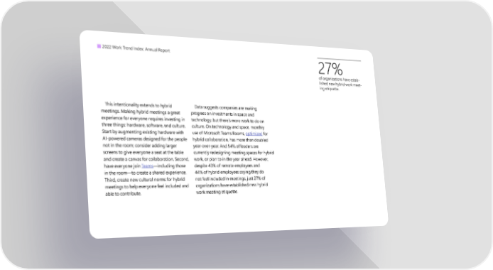 2022 Work Trend Index: Annual Report 27% of organizations have estab- lished new hybrid work meet- ing etiquette. This intentionality extends to hybrid Data suggests companies are making meetings. Making hybrid meetings a great progress on investments in space and experience for everyone requires investing in technology, but there’s more work to do on three things: hardware, software, and culture. culture. On technology and space, monthly Start by augmenting existing hardware with use of Microsoft Teams Rooms, optimized for AI-powered cameras designed for the people hybrid collaboration, has more than doubled not in the room; consider adding larger year-over-year. And 54% of leaders are screens to give everyone a seat at the table currently redesigning meeting spaces for hybrid and create a canvas for collaboration. Second, work, or plan to in the year ahead. However, have everyone join Teams—including those despite 43% of remote employees and in the room—to create a shared experience. 44% of hybrid employees saying they do Third, create new cultural norms for hybrid not feel included in meetings, just 27% of meetings to help everyone feel included and organizations have established new hybrid able to contribute. work meeting etiquette.